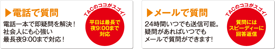 「DVD 通信講座」で受講したので、「質問電話」は良く利用しました。通信での学習には、どうしても学習中の疑問点がすぐに解決できないという心配がありますが、「自分でテキスト・関連条文等を調べ尽くし、最終確認として質問電話に頼る」というスタンスが、より深い理解を得ることができたように感じました。