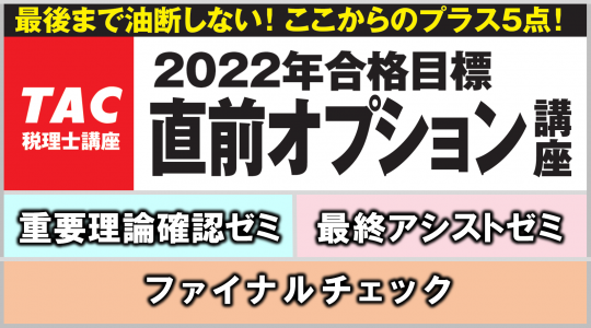 TACでは、総合問題に向き合う機会として『ファイナルチェック』、得点源候補となる論点を再確認する『最終アシストゼミ』を実施します。是非、積極的に活用して本試験合格を勝ち取ってください。心より応援しています!