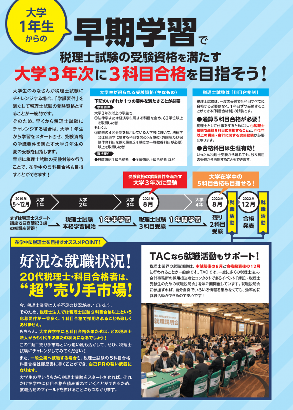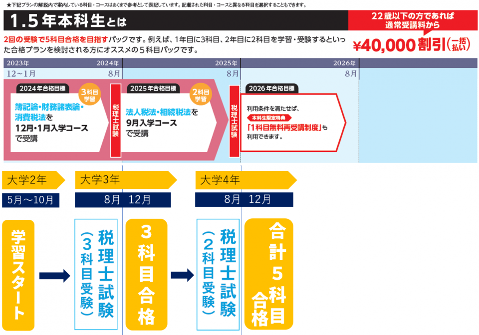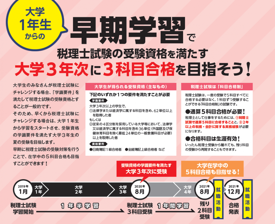 大学在学中の早い時期からチャレンジすれば、在学中の5科目合格を目指せます。この機会に税理士の学習をスタートしましょう!