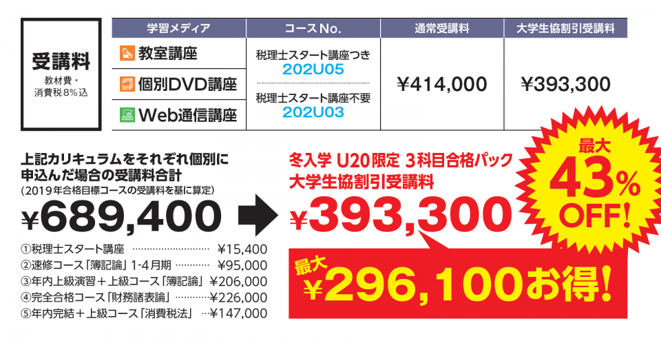 大学生協で割引受講料をお支払い済みの方は、①「申込書類」、②「税理士講座申込書」(下記PDFまたは税理士講座パンフレットに添付)、③年齢が確認できる「身分証のコピー」の3点を税理士講座パンフレット内にある申込封筒(組み立て式)でご郵送ください。大学内代理店。取扱書店で受講申込書を受け取り、受講料をお支払いいただいていない方につきましては、上記①~③の書類に加え、④「銀行振込or郵便振替の控え」をご同封ください。