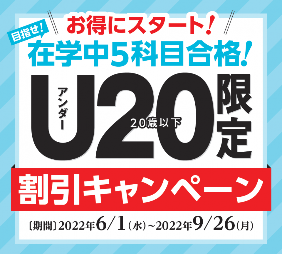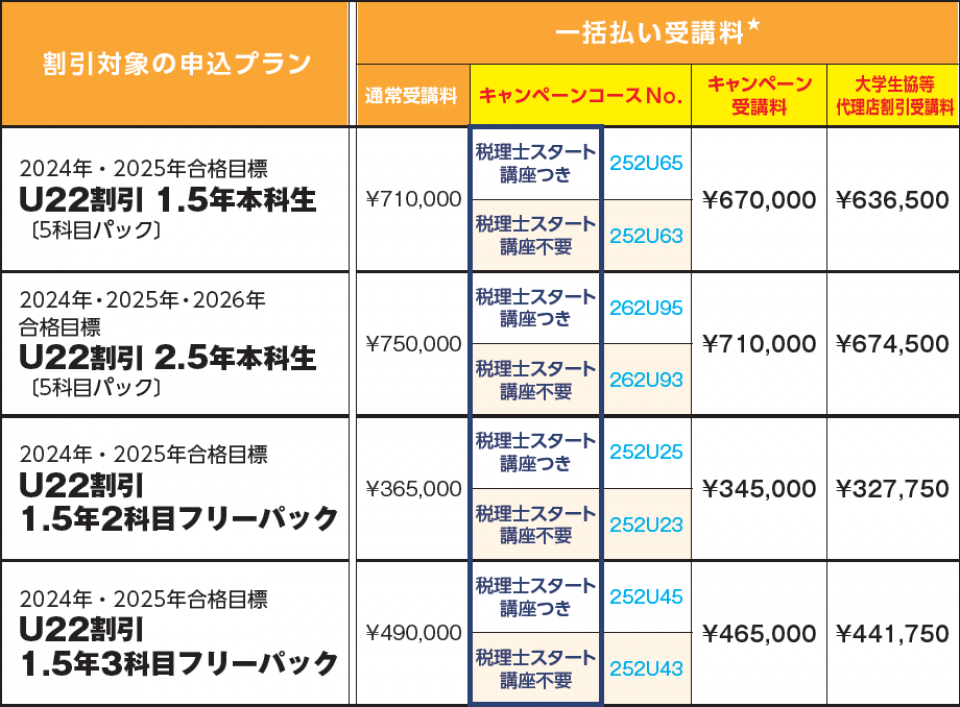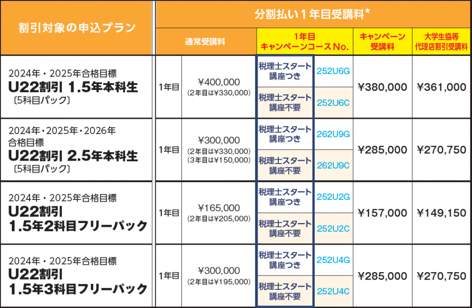 | 22歳以下限定の申込プラン | U22限定受講料 | 大学生協等代理店割引受講料 |