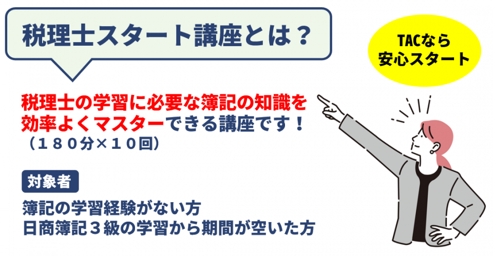税理士スタート講座では、税理士の学習に必要な簿記の知識を効率良く学べます。日商簿記3級の学習経験がない方や、日商簿記3級の学習からブランクがある方は、「税理士スタート講座付き」のプランでお申込みください。無料でご受講いただけます。