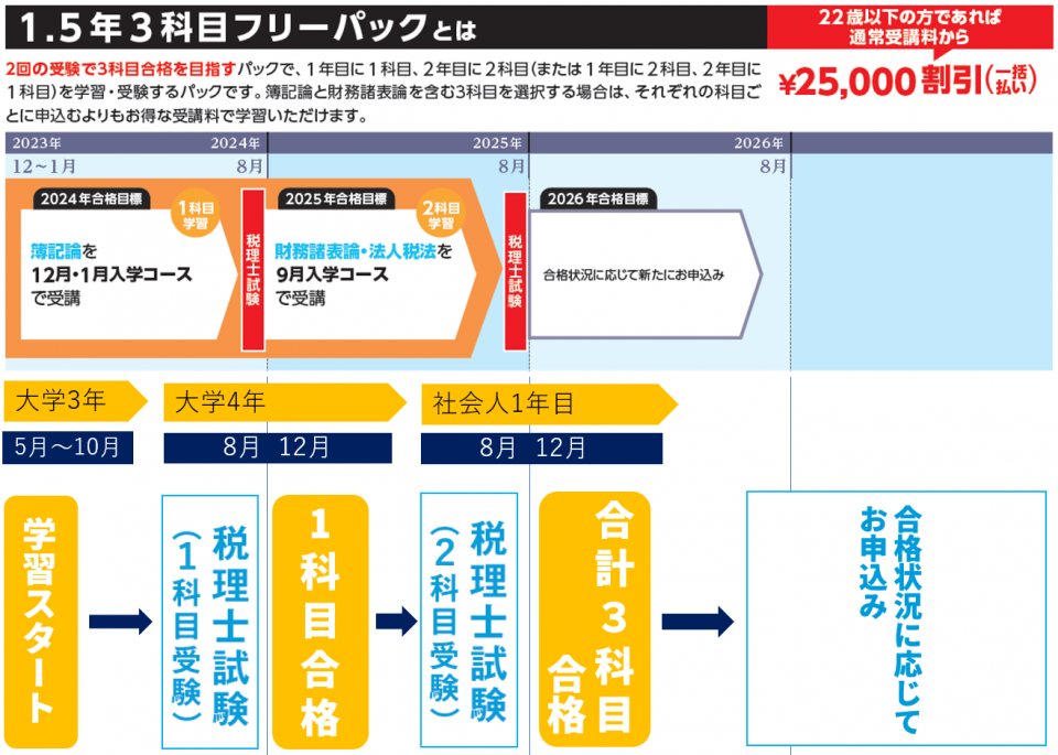 2回の受験で3科目合格を目指すパックで、1年目に2科目、2年目に1科目(または1年目に1科目、2年目に2科目)を学習・受験することができます。簿記論と財務諸表論を含む3科目を選択する場合は、科目ごとに単科生で申し込むよりもお得な受講料で学習いただけます。