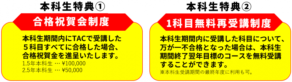 1科目ずつ申込む場合と比較して、受講料最大40%割引に加え、「1科目無料再受講制度」など、「本科生」限定の特典が最大の魅力です。短期間で5科目合格を目指す方におすすめです。