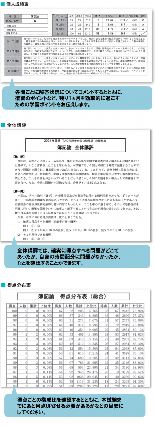 成績表は、TACがインターネット上で提供しているサービス「TAC WEB SCHOOL」を通して、各受験者の「マイページ」にPDFファイルとしてアップロードいたします。ご覧いただくためには、マイページの登録が必要になります。詳細は、お申込み後にお渡しする「受験上の注意」をご確認ください(インターネット申込・郵送申込の場合は会員証送付時に同封いたします)。