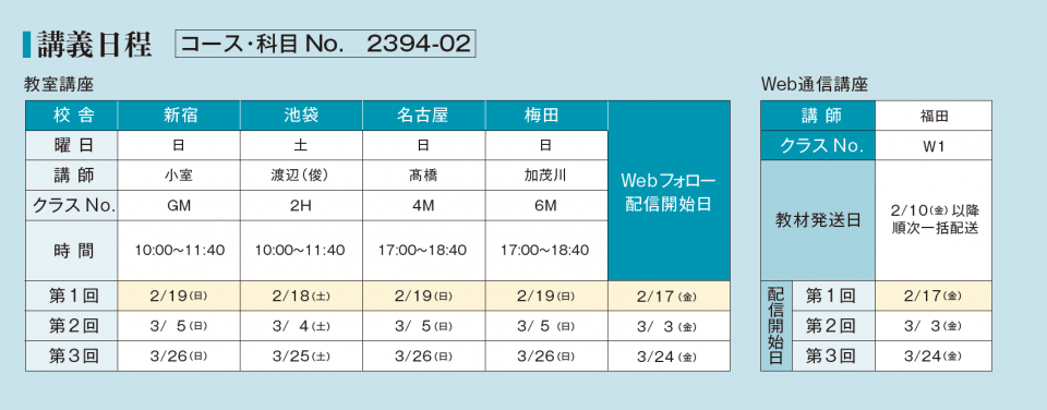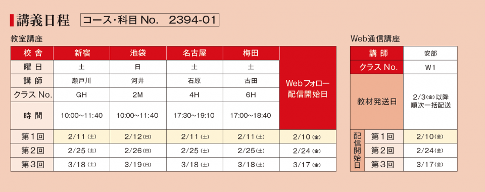 欠席時の教材受け渡しについては、教室講座実施校舎のみ(新宿校・梅田校)となります。