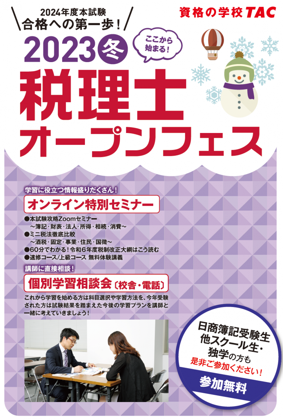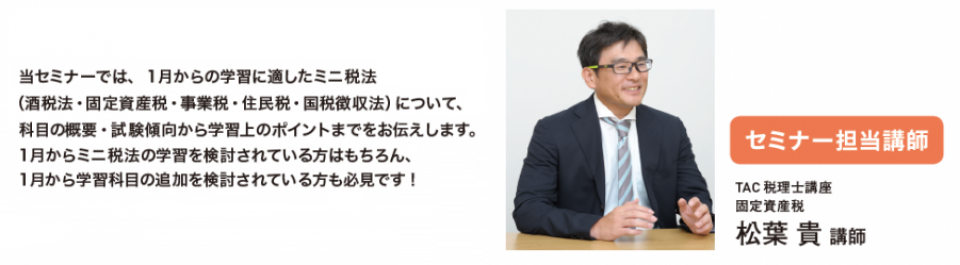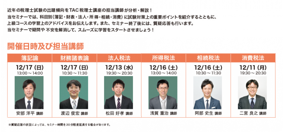 近年の税理士試験の出題傾向をTAC 税理士講座の担当講師が分析・解説!当セミナーでは、科目別(簿記・財表・法人・所得・相続・消費)に試験対策上の重要ポイントを紹介するとともに、上級コースの学習上のアドバイスをお伝えします。また、セミナー終了後には、質疑応答も行います。当セミナーで疑問や不安を解消して、スムーズに学習をスタートさせましょう!