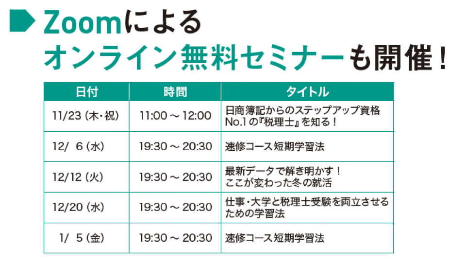 簿記3級合格レベルならすぐに開始できる! 【開講科目】12月入学:簿記・財表/1月入学:全11科目 簿記・財表・相続・消費:週2回/法人・所得:週3回 酒税・固定・事業・住民・国徴:週1回