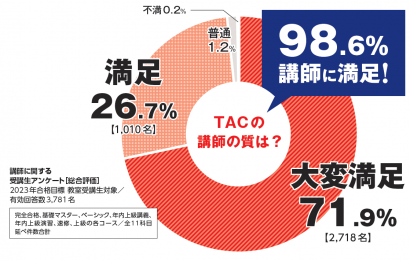 TACでは、受講生のみなさんが直接「講師の質」を評価するアンケートを定期的に実施し、その評価結果を講師へフィードバックしています。受講生の生の声を講義に反映できるように努めているほか、日々、講師ひとりひとりが自己研鑽を重ね、常に最高の講義が提供できるよう心掛けています。税理士受験業界をリードしてきたTACの信頼の高さが、受講生のみなさんの満足度に表れています。