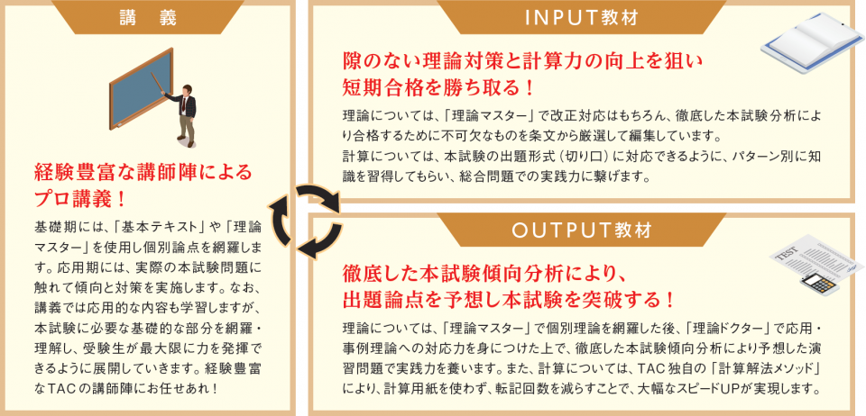 TACでは、理論と計算をリンクさせた講義を展開。学習量の負担を抑え、忙しい社会人の方でも効率的に合格を勝ち取れるカリキュラムを提供しています。また、テキストには学習内容だけでなく、理論の暗記予定表や学習方法、総合問題の解法といった受験テクニックも豊富に掲載。短期合格をトータルサポートしています。
