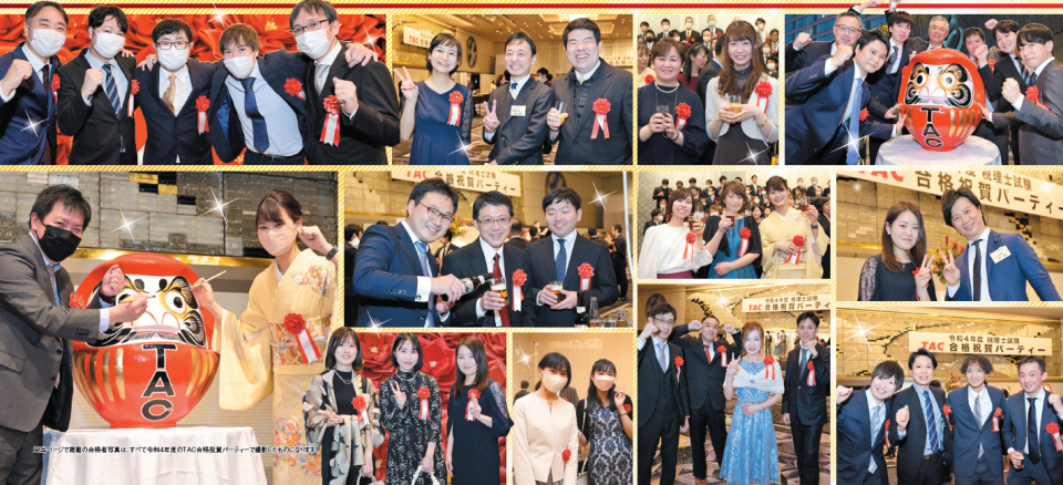 TACでは、官報合格者・認定合格者の皆様のご健闘を称えるとともに、合格を祝しまして合格祝賀会を開催いたします。共に学習されたご友人・TAC講師との歓談や、ネットワーク作りの場ともなりますので、ぜひご出席ください。TAC講師・スタッフ一同、皆様のご来場を心よりお待ちしております。