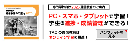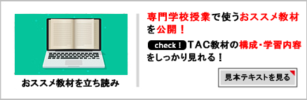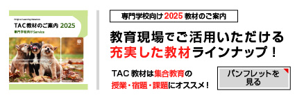 当ページでは、専門学校の学生の皆さまがより早く、合格するために制作されたTACの教材をご紹介、またご注文の方法をご確認いただけます。答練・模試などの直前期商品、情報誌もご紹介しています。