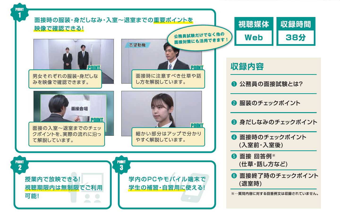 TACでは専門学校様向けに『面接の基本』を押さえるための解説動画を作成いたしました。重要ポイントは停止して丁寧に解説しています。面接対策の基礎教材として是非ご活用ください。