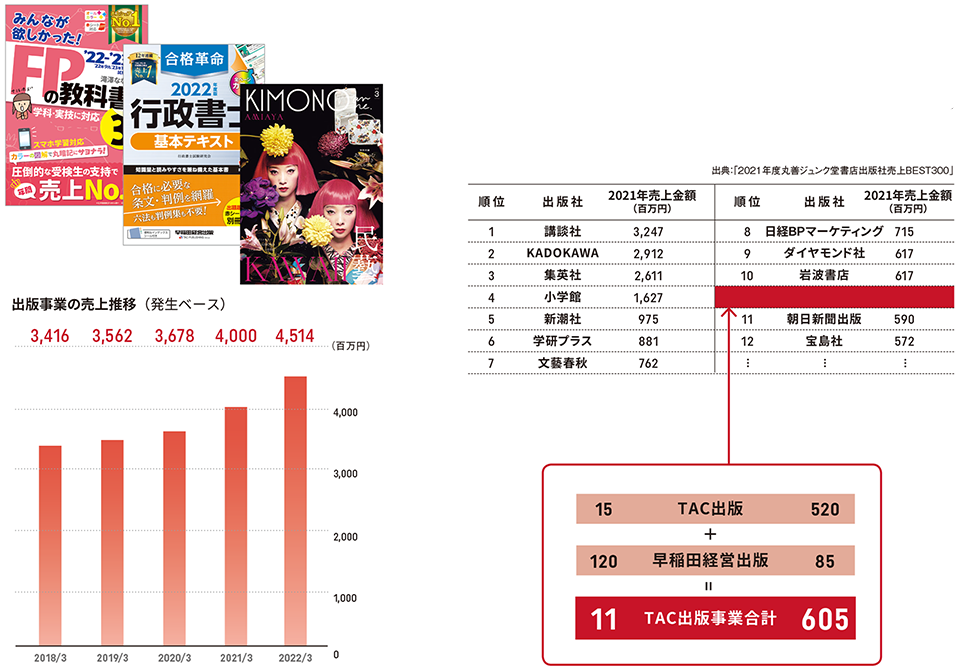 TAC出版と早稲田経営出版を合算すると、著名な出版社とともに、11位相当の売上規模があり、資格書籍を主力とする出版社としては有数の規模を誇っております。
