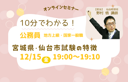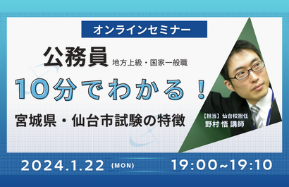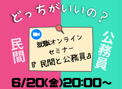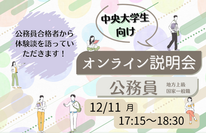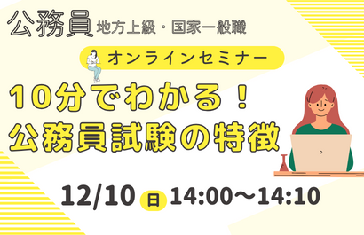 「公務員と民間就職のどちらが向いているのだろう・・・」「民間就活と公務員試験は並行できるのか」などの疑問にお答えします。地方上級・国家一般職、国家総合職の仕事内容や試験制度もご説明します。オンライン(ZOOM)での開催になりますので、お気軽にご参加ください!※当セミナーはZoomを利用して実施いたします。