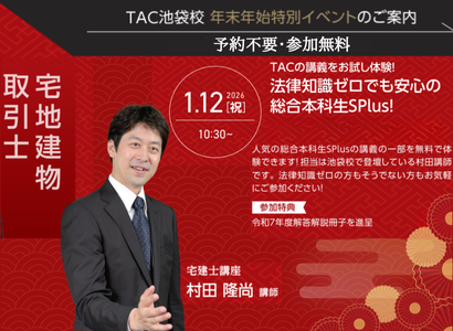 【宅地建物取引士】年末年始特別イベント TACの講義をお試し体験! 法律知識ゼロでも安心の総合本科生SPlus!
