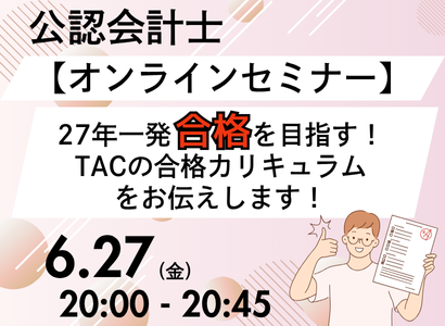 〈対象者:現役大学生〉公認会計士・税理士の魅力とそれぞれの特徴を比較しながらお話しします。少しですが日商簿記検定のお話しもいたします。簿記の知識0(ゼロ)の方におススメです。もちろん学習経験者の方も大歓迎です。後半はTACの魅力やカリキュラムをご案内します。※当セミナーはZoomを利用して実施いたします。