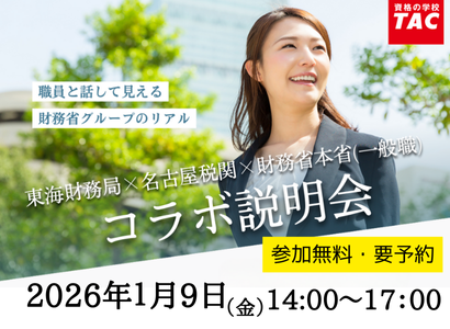 今年度の国家公務員採用試験を受験予定の方に向けて、財務省グループ(東海財務局・名古屋税関・財務省本省一般職)で合同説明会を開催します。当日は、各機関の業務内容や魅力を紹介する説明に加え、職員との座談会も実施いたします。仕事内容や職場の雰囲気、試験対策の体験談などを気軽に聞けるチャンスです。