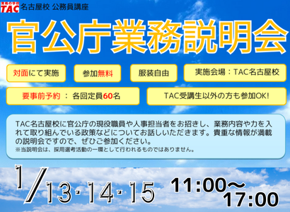 TAC名古屋校に官公庁の現役職員や人事担当者をお招きし、業務内容や力を入れて取り組んでいる政策などについてお話しいただきます。貴重な情報が満載の説明会ですので、ぜひご参加ください。 ※当説明会は、採用選考活動の一環として行われるものではありません。