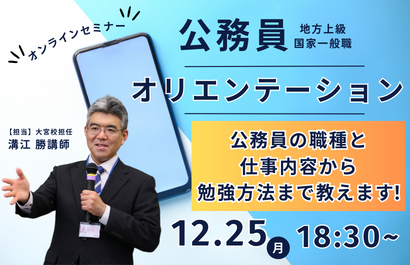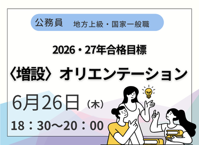2027年度の公務員試験を目指す方必見!!公務員試験の効率的な対策を伝授します!「なんとなく公務員を検討しているけど、何から始めたらいいか分からない・・・」そんな方は是非ご参加ください!早めに学習をスタートして周りと差をつけましょう!学生さんはもちろん既卒の方も大歓迎です!※当セミナーはZoomを利用して実施いたします。