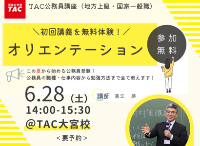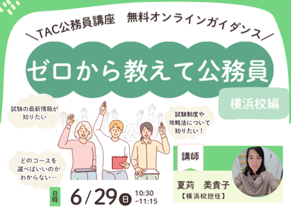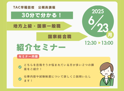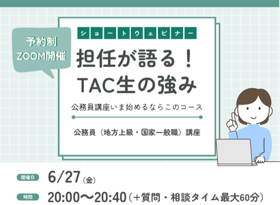 【現役大学生限定!】前半は公務員(地上・国家一般)の仕事の魅力や試験制度、TACの魅力をお話しします。さらにZOOMの「Q&A」機能を利用し、参加者の皆様からの質問にお答えします。※当セミナーはZoomを利用して実施いたします。