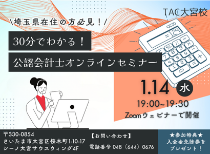 公認会計士の業務内容や試験制度、初学者向けのおすすめの受講プランを約30分でご案内!TAC大宮校の校舎の様子やフォロー制度もご紹介します◎セミナー後のアンケート回答で【入会金免除券】をプレゼント!※当セミナーはZoomを利用して実施いたします。