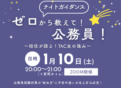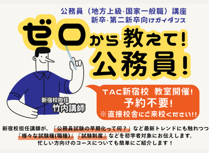 公務員試験対策の“始め方”に不安や迷いがある方は必見! 行政事務職志望ならば忙しい方でも大丈夫! 「TAC生の強みとは?」「どのコースで始めれば間違いないの?」 長年に渡り多くの受験生を見てきた担任講師目線でズバッとお伝えします!」※当セミナーはZoomを利用して実施いたします。