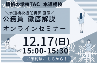 2026・27年目標で公務員講座を受講されている学生の皆様、およびこれから公務員受験を検討される皆様に、年末年始の過ごし方や公務員の試験種ごとの勉強の注意点などをお話しします。25年に公務員試験に合格された方をお呼びしますので、合格者の経験談も聞けるチャンスです。※当セミナーはZoomを利用して実施いたします。