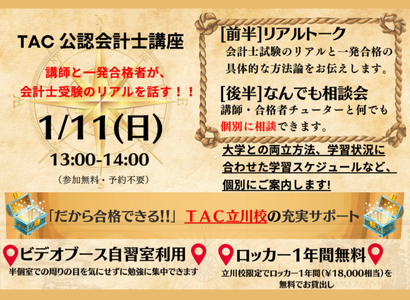 <前半・リアルトーク>会計士試験のリアルと、一発合格の方法論をお伝えします。<後半・なんでも相談会>大学との両立など、講師や合格者になんでも相談できます。予約不要☆参加無料!