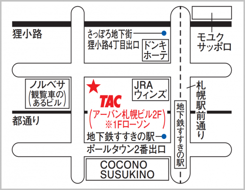 TAC札幌校はさっぽろ地下街狸小路4丁目出口より徒歩2分、すすきの駅より徒歩3分の好立地にあります!