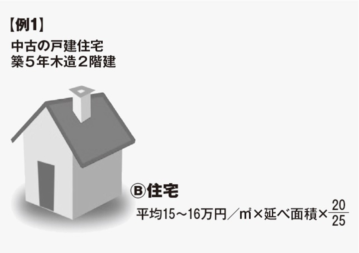 そして、新築であればこれで終わりですが、中古物件については経年劣化がありますので、その分を差し引く必要があります。木造住宅であれば、耐用年数的には25年くらいみておけばちょうどよい水準ですので、この築5年の中古物件という例の場合、残りの耐用年数が20年になります。これを計算し、土地の価格がA、建物の価格がB、これを足したA+Bという金額が、「原価法」の考え方を充用した評価になります。