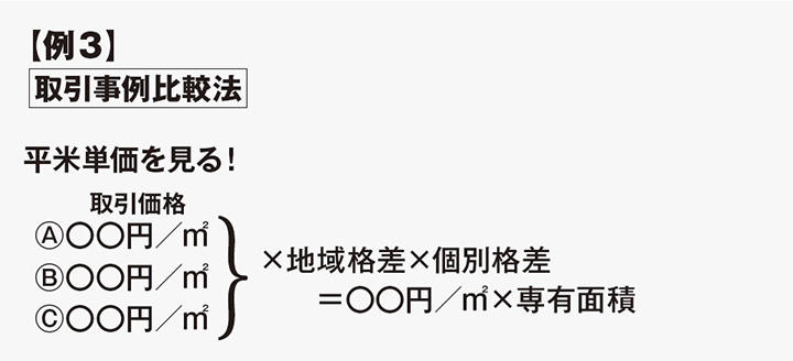 例えば、似たようなマンションの取引募集が3つあるといった場合、総額で売りに出ていると思いますので、必ず面積で割り、単価を出してください。単価にすべての価値が凝縮されて、同じ目線で比べられますので、そうすると「取引価格Aは〇〇円/㎡」、「取引価格Bは〇〇円/㎡」、「取引価格Cは〇〇円/㎡」と出ますので、それに対し自分が検討しているマンションと比較します。