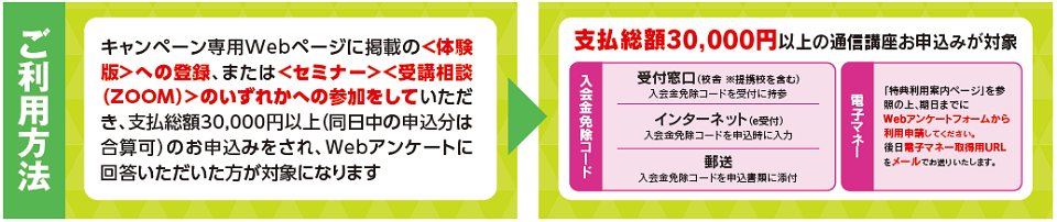 • 上記いずれかにご参加いただき、支払内総額¥30,000円以上(同日申込分は合算可)のお申し込みをされ、Webアンケートに回答いただいた方が対象になります。