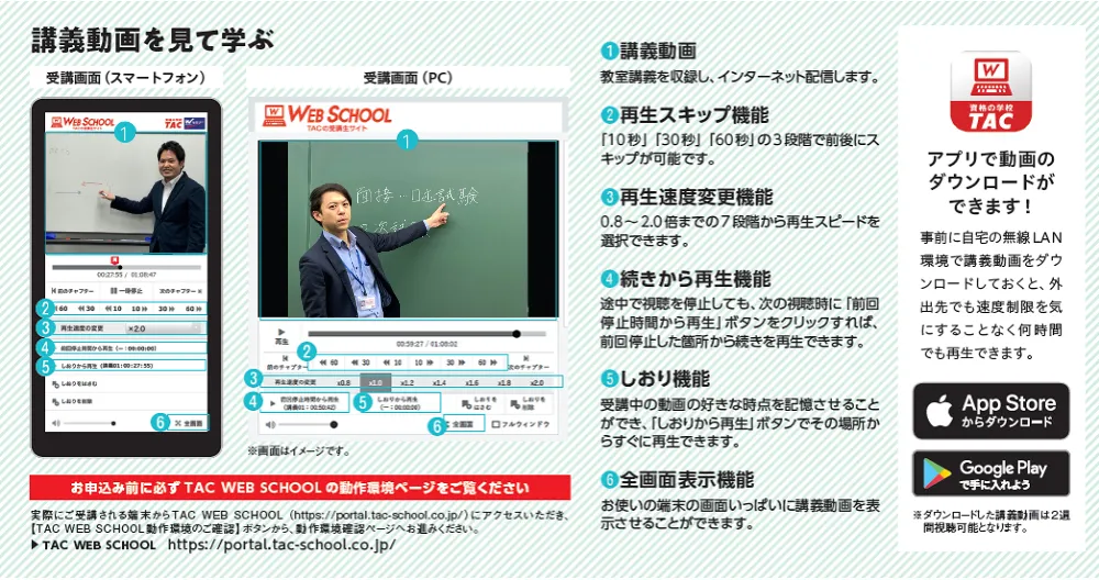 詳細な動作環境につきましては、TAC WEB SCHOOL(https://portal.tac-school.co.jp/)にてご確認ください。