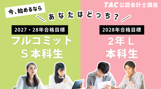 大学や仕事と両立しながら合格を目指すなら断然「2年L本科生」、受験に専念し短期合格にチャレンジしたい方は「フルコミットS本科生」がオススメです!